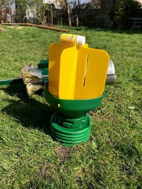 Traps should be set 10-15 cm into the turf to firmly fix the traps use a retention stick and cable tie if required. The yellow fins and attractant encourage adult chafer looking for mates or suitable egg laying areas in to the traps. Unpack the lures remove the red seal cap, pull the fins to one side and slip lure bottle through hole in fins and fix with diffuser cap. The trap is now ready for use.